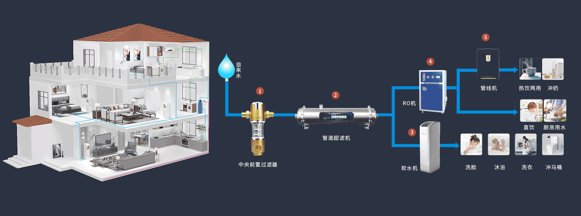 全屋智能凈水以飲用水入戶為標準,根據各家各戶以及地區不同的用水需求,使用不同的凈水產品來滿足家庭飲用水所需,將家庭飲水、廚房飲水、生活飲用水等用水方式做到全方面凈化,成為家庭凈水的堅固屏障。